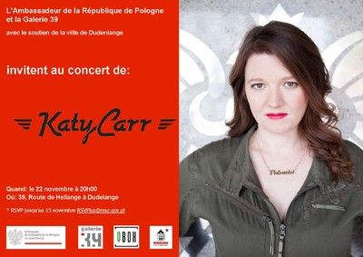 Ambasada RP w Luksemburgu zaprasza serdecznie na koncert Katy Carr, który odbędzie się we czwartek, 22 listopada o godz. 20.00 w Galerie 39 w Dudelange przy 39 rte de Hellange.