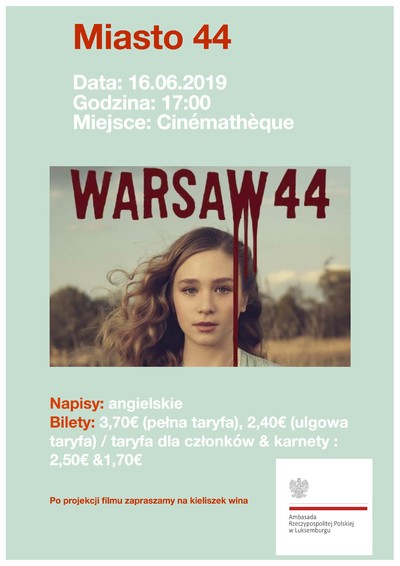 Przypominamy, iż dziś (niedziela, 16 czerwca) o godz. 17.00 zobaczyć będzie można w Cinematheque m.st. Luksemburga polski film „Miasto 44”.