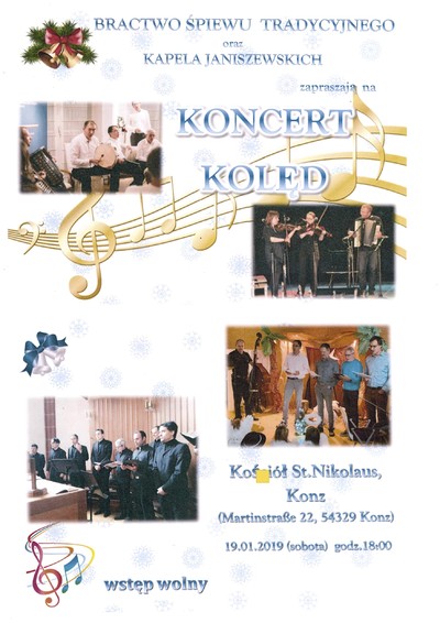 Bractwo Śpiewu Tradycyjnego wraz z Kapelą Janiszewskich zapraszają serdecznie na koncert kolęd polskich (i nie tylko), który odbędzie się 19 stycznia (sobota) o godz. 18.00 w kościele św. Mikołaja w Konz przy Martinstrasse 22.