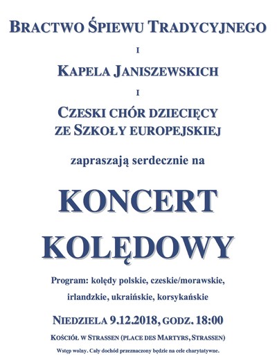 Mamy zaszczyt zaprosić Państwa na tradycyjny koncert bożonarodzeniowy, który odbędzie się w niedzielę 9 grudnia 2018 r. o godz. 18 w kościele w Strassen.