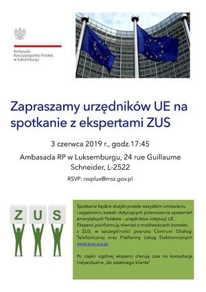 Ambasada RP w Luksemburgu przypomina i raz jeszcze zaprasza serdecznie na spotkanie z ekspertami z ZUS na temat przenoszenia składek emerytalnych z ZUS do systemu emerytalnego instytucji UE.