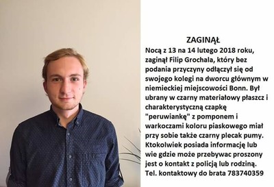 Nocą z 13 na 14 lutego br. zaginął Filip Grochala, który bez podania przyczyny odłączył się od swojego kolegi na dworcu głównym w Bonn (Niemcy).