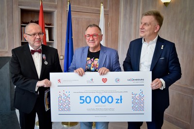Pan Ambasador wręczył Panu Jerzemu Owsiakowi, Prezesowi Fundacji, czek na kwotę 50.000 zł ufundowaną przez Ambasadę przy udziale Polsko-Luksemburskiej Izby Gospodarczej (PLIG). Fot. Damian Burzykowski