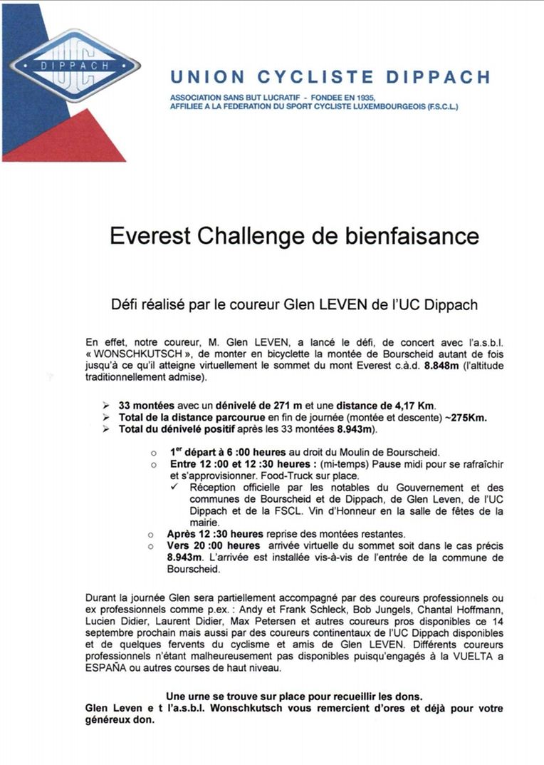 Glenovi Levenowi można nie tylko kibicować, ale także spróbować przejechać razem z nim choćby cześć tej trasy. Swoje wsparcie w tym zakresie zapowiedzieli zresztą znani kolarze luksemburscy, m.in.: Andy i Frank Schleck oraz Laurent i Lucien Didier. Wydarzenie to ma także aspekt charytatywny. Każdy, kto przyjedzie podziwiać zmagania kolarza z wielką górą, będzie mógł także wrzucić dobrowolny datek do skarbonki ustawionej na starcie. Pieniądze te wesprą działalność stowarzyszenia Wonschkutsch asbl, którego misją jest spełnianie ostatniego marzenia osób nieuleczalnie chorych.