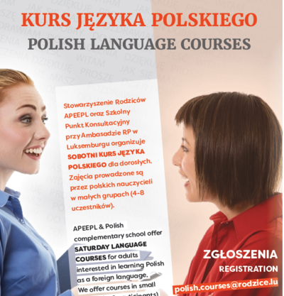Stowarzyszenie Rodziców Uczniów Szkoły Polskiej (APEEPL) oraz Szkoła Polska przy Ambasadzie RP w Luksemburgu organizują sobotnie kursy języka polskiego dla dorosłych. Zajęcia prowadzone są w małych grupach (4-8 osób).
